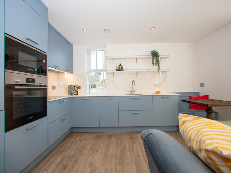 This sleek ground-floor one-bedroom apartment offers an airy open-plan living area with a contemporary kitchen and breakfast bar. It’s located within our award-winning Spinning Acres development.