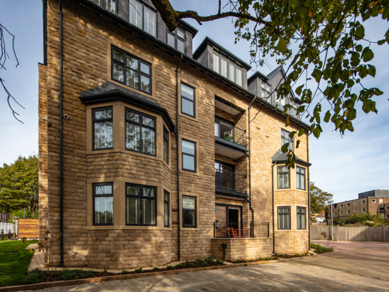 As part of the Spinning Acres Development is this exclusive first-floor, two-bedroom apartment in Far Headingley offers lift and stair access. The apartment features panelled wooden doors, an open-plan living area with a large bay window, and a contemporary kitchen.