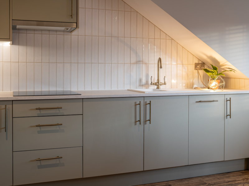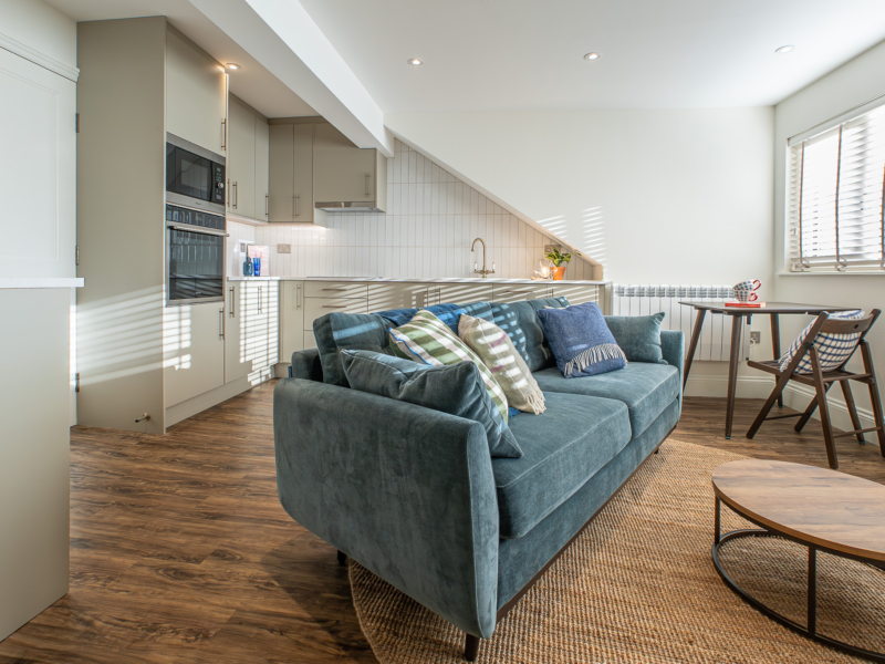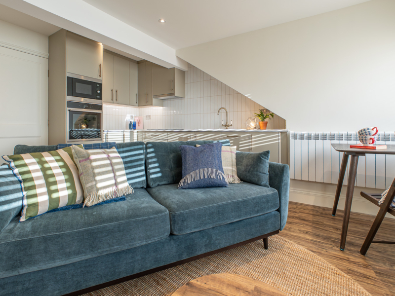 This beautifully renovated and furnished one-bedroom apartment in central Horsforth seamlessly blends period features with modern comforts. It boasts stunning rooftop views and a sleek white and light grey kitchen.