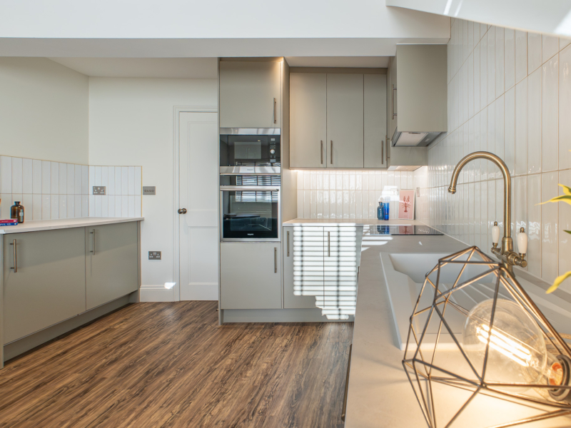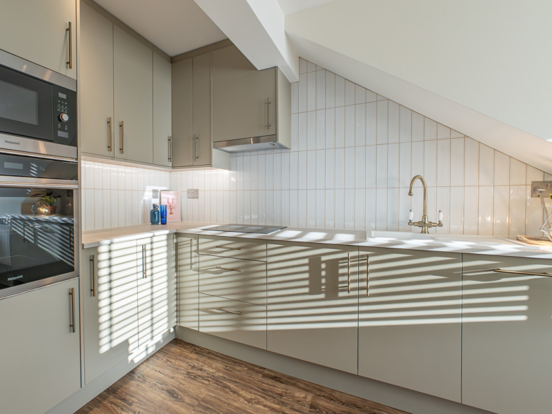 Within the Spinning Acres Development enjoy the best of both worlds in this two-bedroom apartment in a prime Leeds location with leafy surroundings and easy access to Headingley’s amenities. The open-plan living space features a striking dark green kitchen with gold accents.