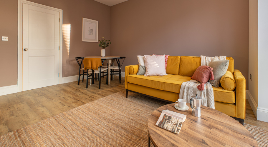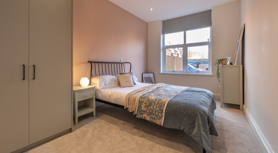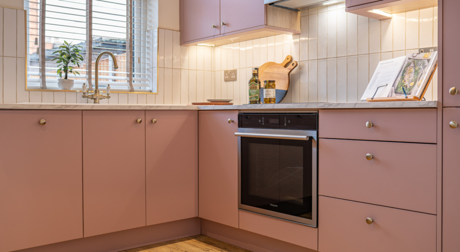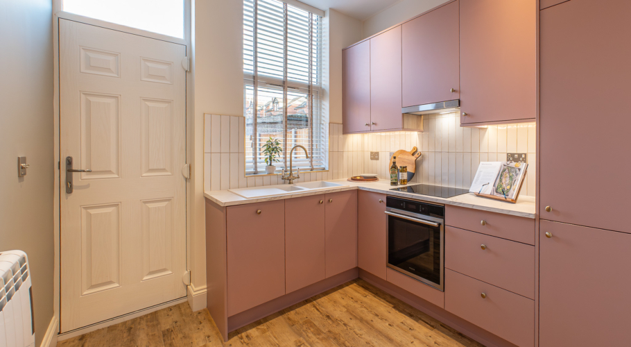 Apartment 1 offers refined, design-led living with a private entrance and easy step-free access from the rear. The bespoke kitchen features antique rose cabinetry, brass handles, Padstow porcelain tiles and oak-effect worktops, creating a warm and elegant aesthetic.