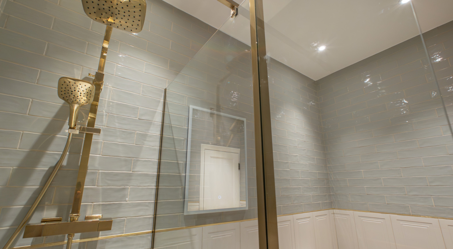 The Instinct bathroom is styled in sage green with porcelain panelling and high-quality fixtures. As part of an all-electric, solar-supported development, residents benefit from Rointe Wi-Fi smart heaters, a KERS hot-water recovery system, and shared solar PV generation, offering improved efficiency and lower running costs.